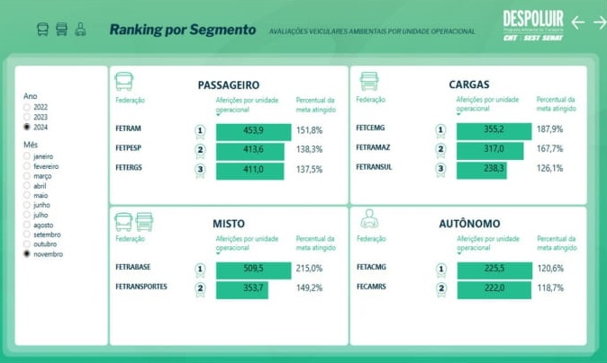 Durante o ano de 2024, a equipe do Programa DESPOLUIR ligado a Federação das Empresas de Transporte de Passageiros de Minas Gerais (FETRAM) manteve por oito meses, a liderança do ranking nacional de avaliações veiculares ambientais por unidade operacional no Programa Despoluir. Em novembro não foi diferente, a equipe somou 453,9 aferições por unidade operacional, superando em 151,8% a meta estabelecida, demonstrando o empenho e compromisso das empresas mineiras com a sustentabilidade e a melhoria da qualidade do ar.